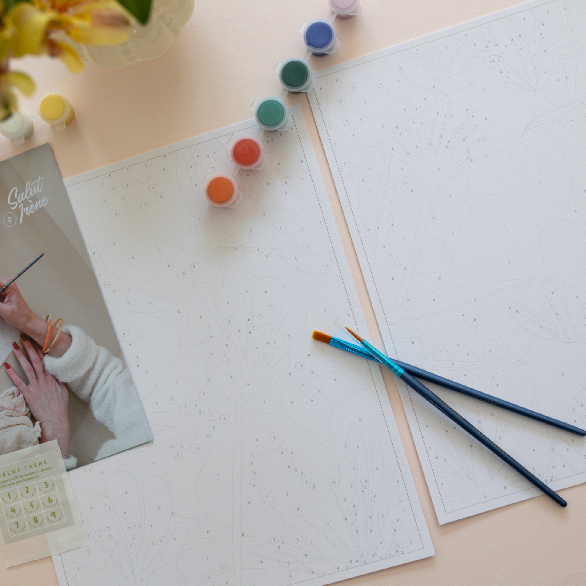 Tout le nécessaire pour réaliser 2 illustrations à peindre. Un kit DIY pensé pour éveiller votre créativité et vous offrir une parenthèse relaxante.