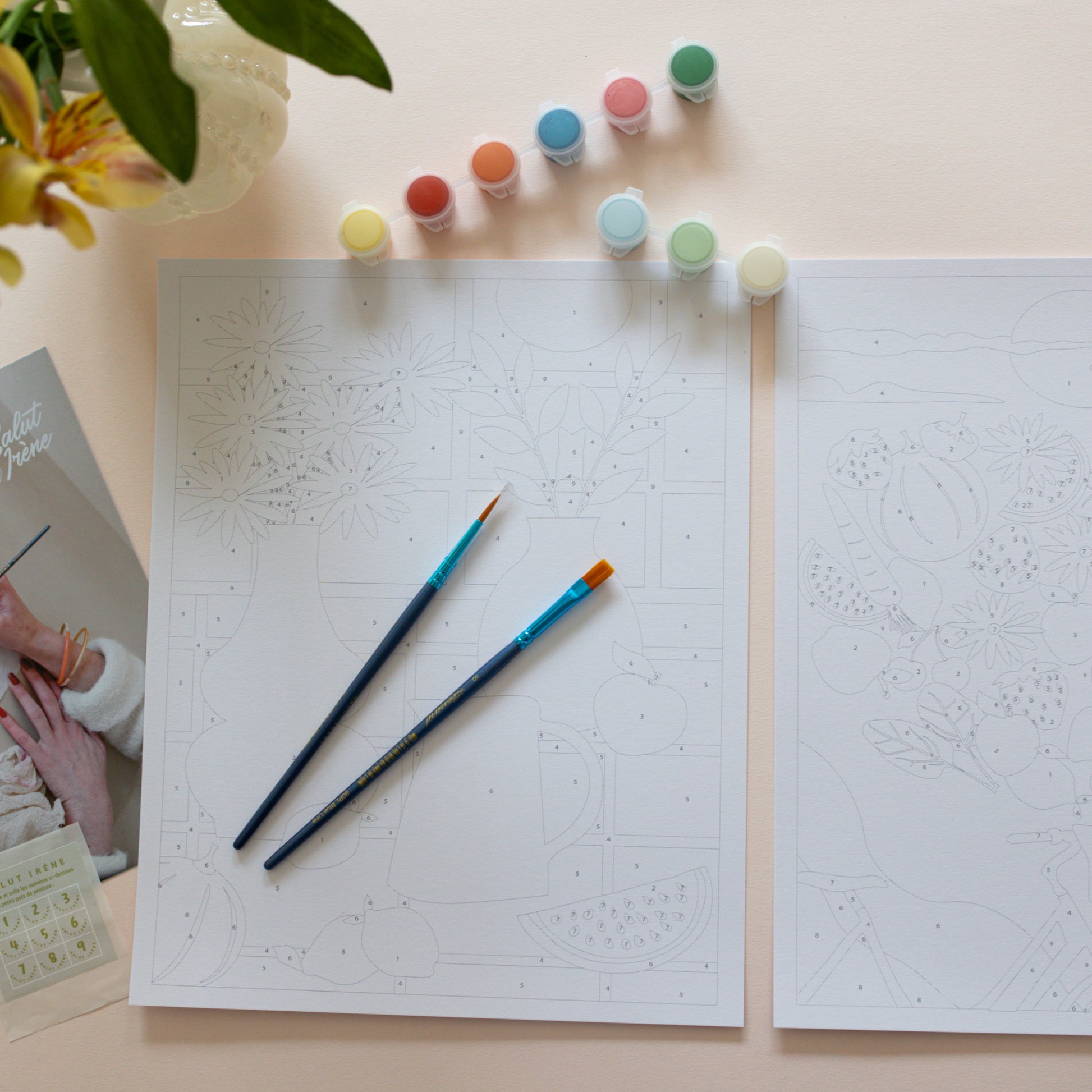 - 2 illustrations numérotées à peindre (format 24 x 30 cm), imprimées en France sur un papier italien de qualité (300g).